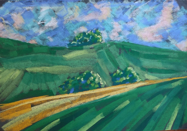 Working in soft pastel on sanded paper, the artist embraces a tactile, physical process where marks are pressed, dragged, and layered with urgency. The textured surface holds traces of movement, creating a subtle tension between force and fragility. Free from formal academic training, the approach remains intuitive and unrestrained. What emerges is not a depiction of land, but an echo of having stood within it.